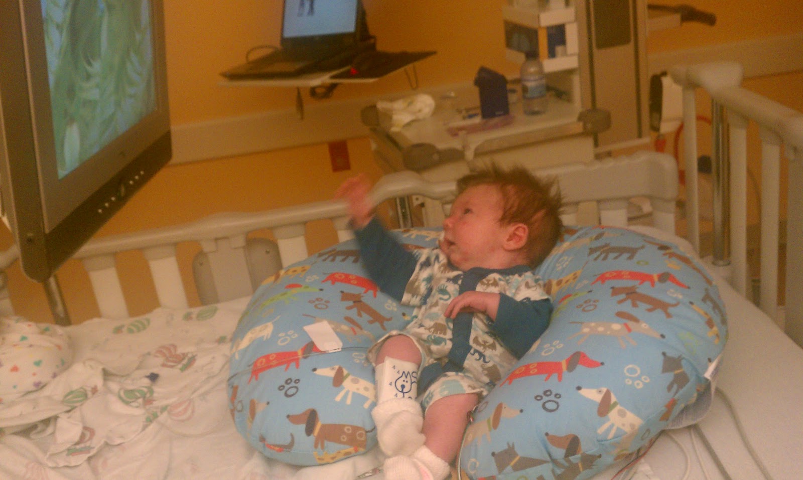So yesterday during rounds they decided to do an Echo to look at his heart. They said that his heart was looking fine, although one of his valves might be a little leaky. In the afternoon, Owen decided on his own that he didn't need his NG tube anymore and pulled it out. Since the doctors were already talking about pulling his NG tube they just decided to leave it out and see how he does on his own again. Since he pulled out his NG tube by himself he has for the most part been doing quite well with the feeds.